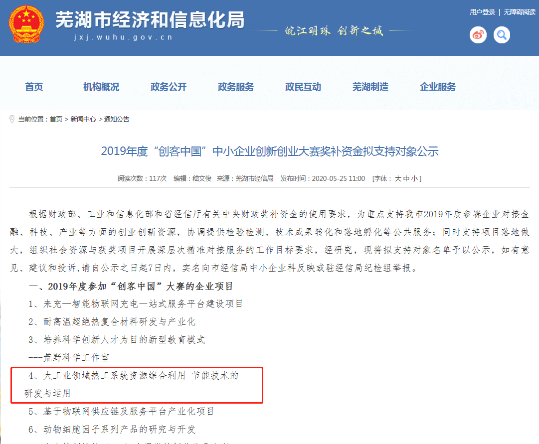 其中我公司創(chuàng)新創(chuàng)業(yè)項(xiàng)目——大工業(yè)領(lǐng)域熱工系統(tǒng)資源綜合利用節(jié)能技術(shù)的研發(fā)與運(yùn)用,獲得蕪湖市第四名,并取得獎(jiǎng)補(bǔ)資金支持,在此表示熱烈祝賀。下一步,公司仍將整合資源,奮發(fā)作為,再上新臺(tái)階,為國(guó)家節(jié)能環(huán)保事業(yè)貢獻(xiàn)力量!