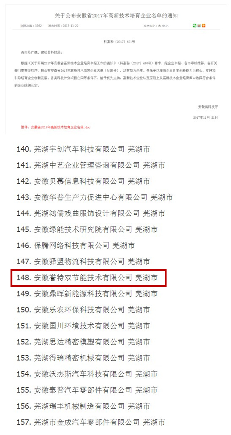 安徽省科技廳于2017年11月23日,發(fā)布本年度安徽省高新技術(shù)培育企業(yè)名單,我公司安徽譽(yù)特雙節(jié)能技術(shù)有限公司通過審核,排續(xù)148號。公司全體同仁須齊心協(xié)力、勵精圖治,順利通過2018年的專項(xiàng)評審工作,獲得授牌!