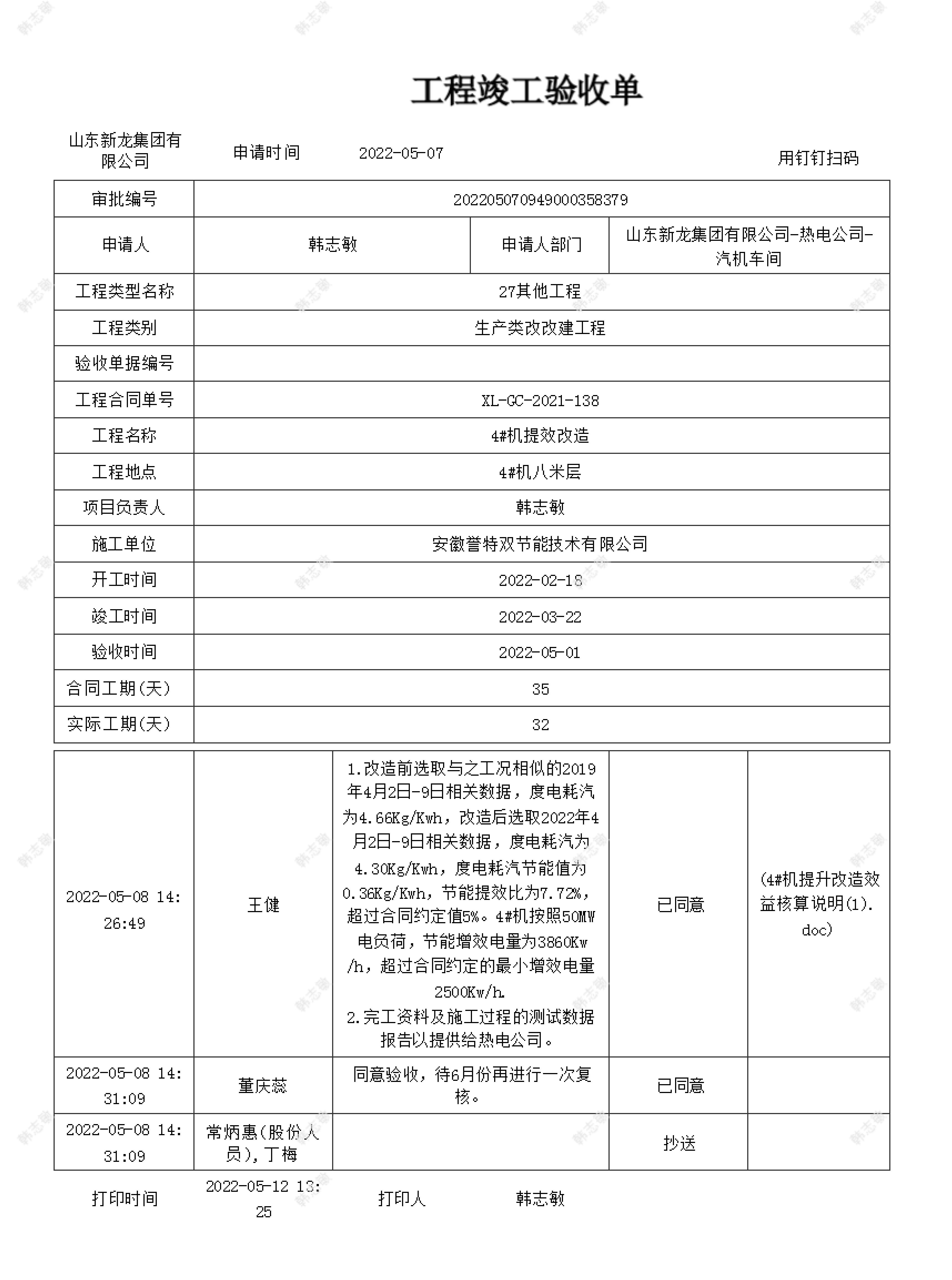 我安徽譽特雙節(jié)能技術(shù)有限公司,承接的山東新龍集團55MW汽輪機4#機組通流結(jié)構(gòu)技改提效項目,自2022年3月25日一次性開機沖轉(zhuǎn)成功并網(wǎng)以來,當(dāng)前已順利運行42天,機組各項參數(shù)指標均正常、穩(wěn)定。項目于近日順利通過工程驗收,實測同等工況條件下,節(jié)能提效比例達7.72%,遠超合同約定的5%考核指標,同時合同約定改造工期為35天,實際完成為32天,節(jié)約三天時間。