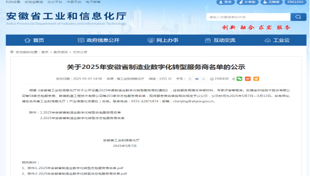 根據(jù)《安徽省工業(yè)和信息化廳關(guān)于公開征集2025年度制造業(yè)數(shù)字化轉(zhuǎn)型服務(wù)商的通知》,經(jīng)各服務(wù)商提交申報(bào)材料、專家評審等程序,省工信廳最終確定發(fā)布203家服務(wù)商,我公司名列榜單,在此表示熱烈祝賀!