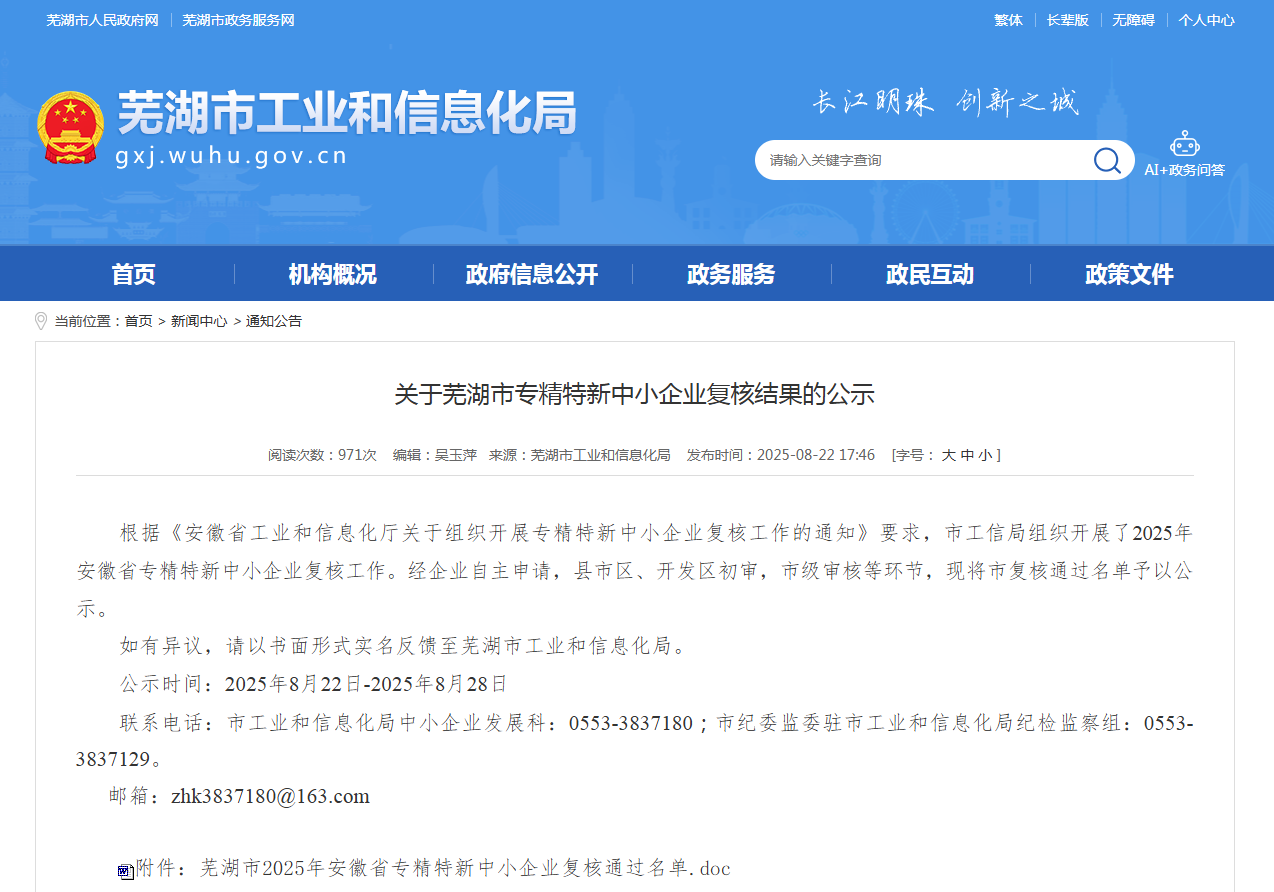 喜訊--熱烈祝賀我司順利通過(guò)“蕪湖市專(zhuān)精特新中小企業(yè)”復(fù)核