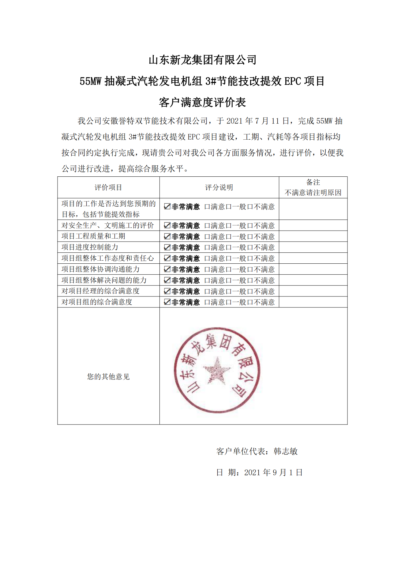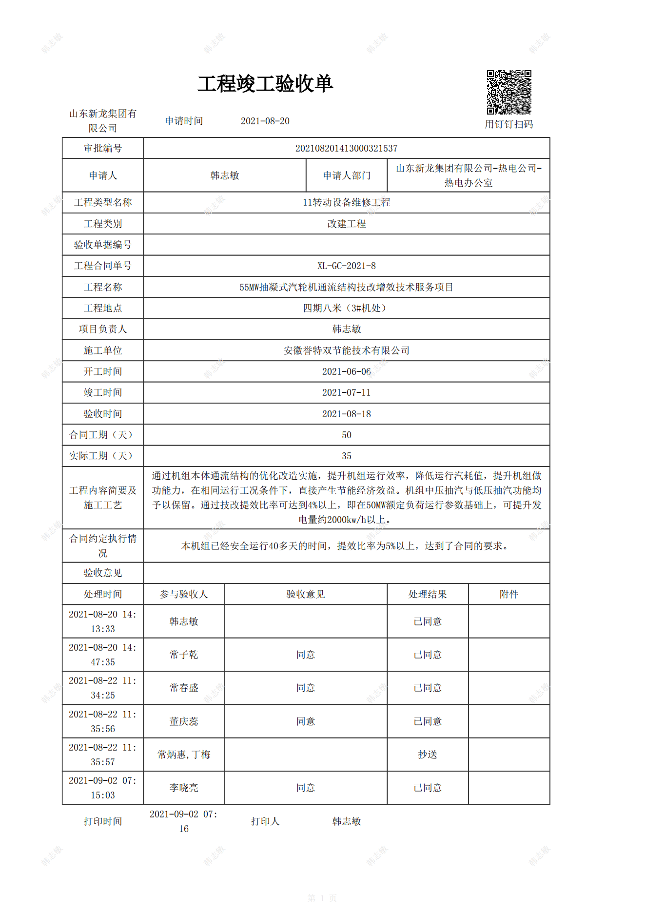 我公司EPC總包節(jié)能改造服務項目——山東新龍集團55MW高壓抽凝式汽輪機組通流改造節(jié)能提效項目順利通過工程驗收,機組各項技術指標均正常、穩(wěn)定,綜合節(jié)能提效比例達5%以上,實測值7.3%;