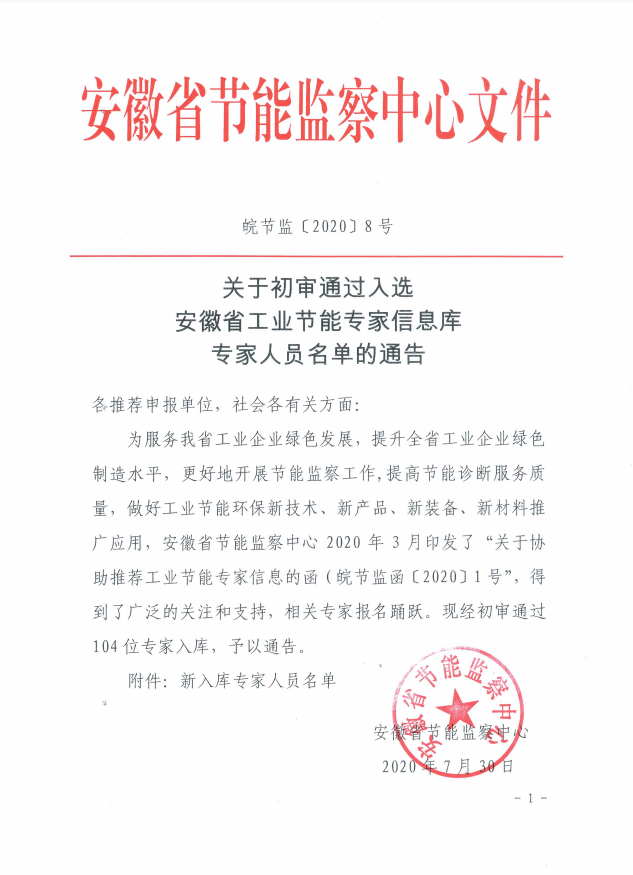 熱烈祝賀我公司總經(jīng)理袁克、副總經(jīng)理李清峰等同志成功入選安徽省工業(yè)節(jié)能專(zhuān)家信息庫(kù)