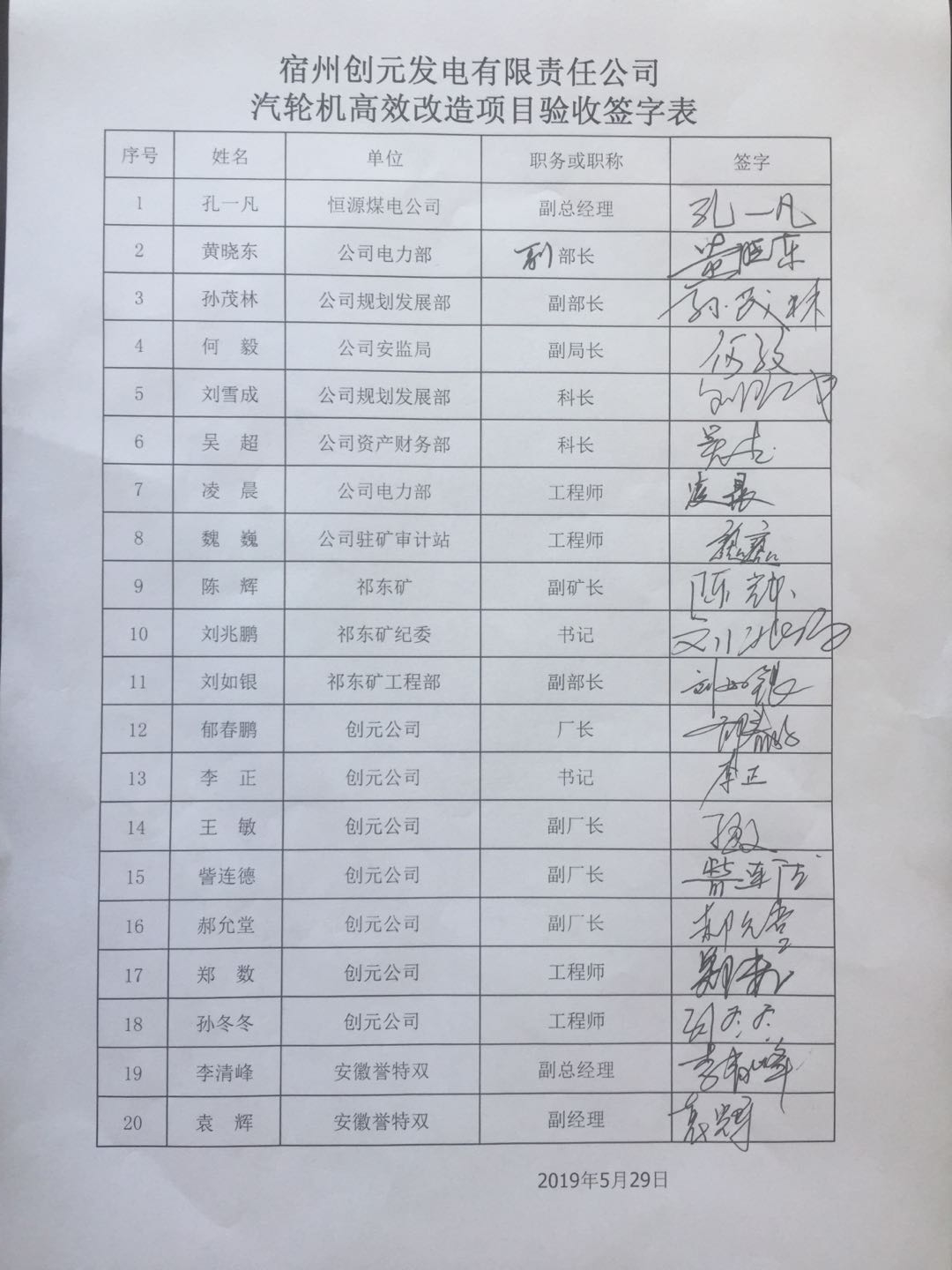 對我公司以EPC模式實(shí)施的宿州創(chuàng)元發(fā)電有限責(zé)任公司,兩臺12MW汽輪發(fā)電機(jī)組通流結(jié)構(gòu)綜合技改提效項(xiàng)目進(jìn)行全系統(tǒng)工程驗(yàn)收,驗(yàn)收結(jié)論:本工程完成合同約定所有內(nèi)容,達(dá)到設(shè)計(jì)要求,同意通過驗(yàn)收!