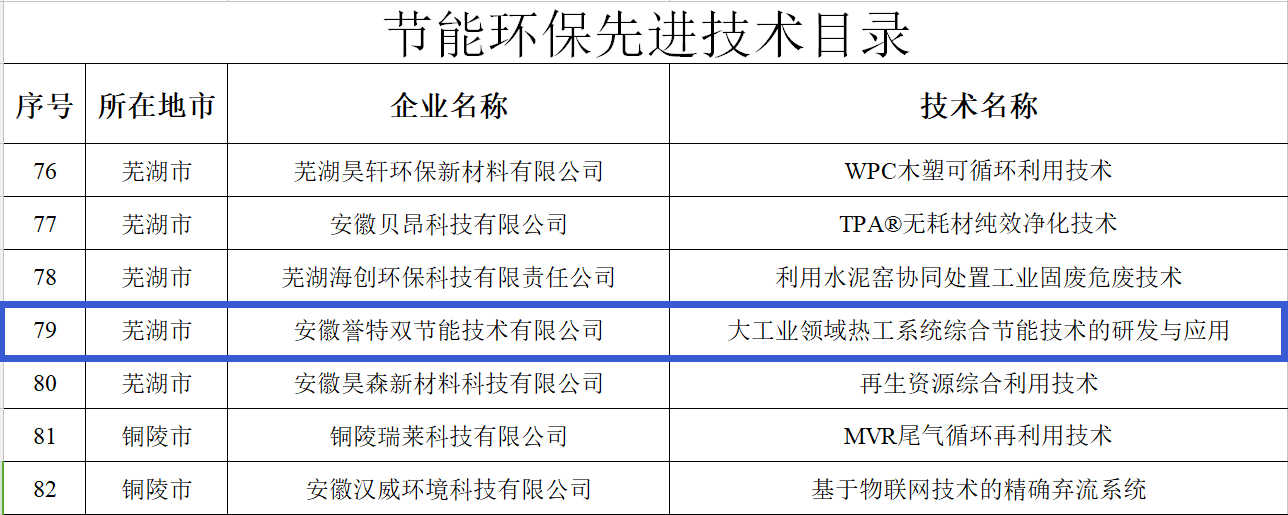 2018年11月28日,安徽省經(jīng)信委發(fā)布2018年度全省工業(yè)領(lǐng)域節(jié)能環(huán)保產(chǎn)業(yè)“五個一百”推介目錄,熱烈祝賀我公司安徽譽(yù)特雙節(jié)能技術(shù)有限公司“大工業(yè)領(lǐng)域熱工系統(tǒng)綜合節(jié)能技術(shù)的研發(fā)與應(yīng)用”入選節(jié)能環(huán)保先進(jìn)技術(shù)目錄,“汽輪機(jī)通流改造提效”入選節(jié)能環(huán)保重點(diǎn)項(xiàng)目目錄。