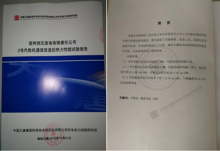 由具備國家一級專業(yè)資質——中國大唐集團科學技術研究院有限公司華東電力試驗研究院,對照機組改造前實際運行參數,純凝運行工況汽耗值為5.14kg/kw.h,改造后機組純凝工況汽耗值為4.58kg/kw.h,在同等運行工況條件下,汽耗值下降0.56kg/kw.h,下降幅度即節(jié)能提效比例為10.91%,按原機組12MW同等運行工況條件下,可實現節(jié)能提效電量為1309.2kw/h,按年運行7500小時計算,年可實現節(jié)能經濟效益490萬元,節(jié)能效益與社會效益均非常顯著。