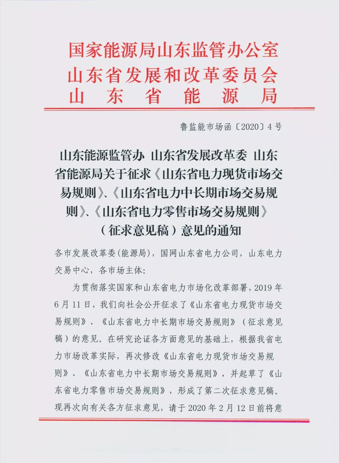 北極星售電網(wǎng)訊:北極星售電網(wǎng)獲悉,國家能源局山東能監(jiān)辦、山東省發(fā)改委、山東省能源局日前發(fā)布了關(guān)于征求《山東省電力現(xiàn)貨市場交易規(guī)則》、《山東省電力中長期市場交易規(guī)則》、《山東省電力零售市場交易規(guī)則》(征求意見稿)意見的通知。山東為貫徹落實(shí)國家和山東電力市場化改革部署,2019年6月11日,山東省向社會(huì)公開征求了《山東省電力現(xiàn)貨市場交易規(guī)則》、《山東省電力中長期市場交易規(guī)則》(征求意見稿)的意見。在研究論證各方面意見的基礎(chǔ)上,根據(jù)山東省電力市場改革實(shí)際,再次修改《山東省電力現(xiàn)貨市場交易規(guī)則》、《山東省電力中長期市場交易規(guī)則》,并起草了《山東省電力零售市場交易規(guī)則》,形成了第二次征求意見稿?,F(xiàn)再次向有關(guān)各方征求意見,并請求社會(huì)各界于2020年2月12日前將意見反饋。