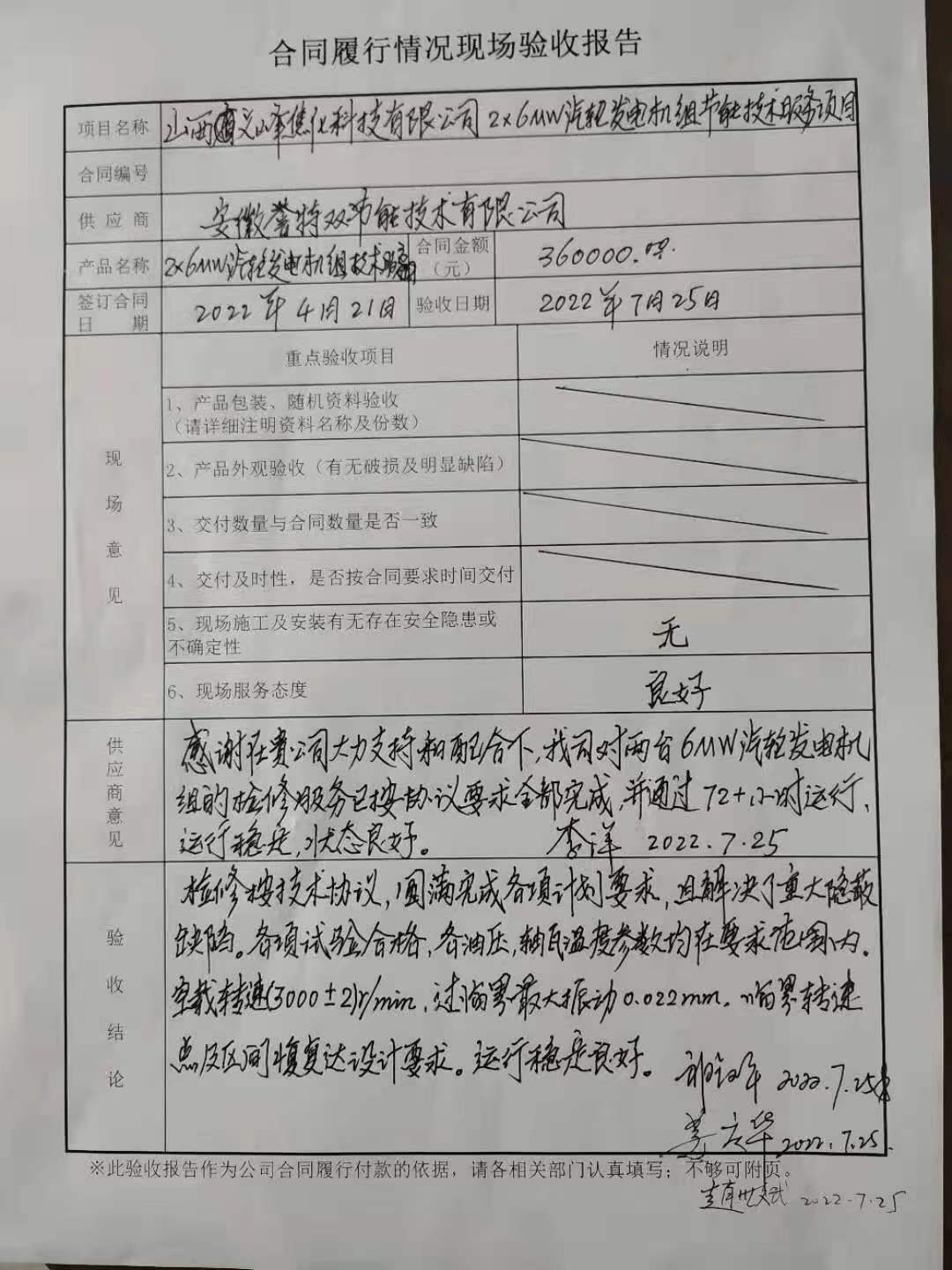 近日,我安徽譽特雙節(jié)能技術有限公司,承接的山西文峰焦化科技有限公司2X6MW汽輪機組檢修技術服務項目,兩臺機組均按合同與技術協(xié)議的有關約定,完成項目施工,并順利通過工程驗收。