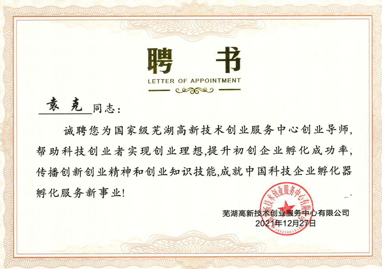 近日,我公司總經(jīng)理袁克同志被聘為國家級蕪湖高新技術(shù)創(chuàng)業(yè)服務(wù)中心有限公司“創(chuàng)業(yè)導(dǎo)師”。