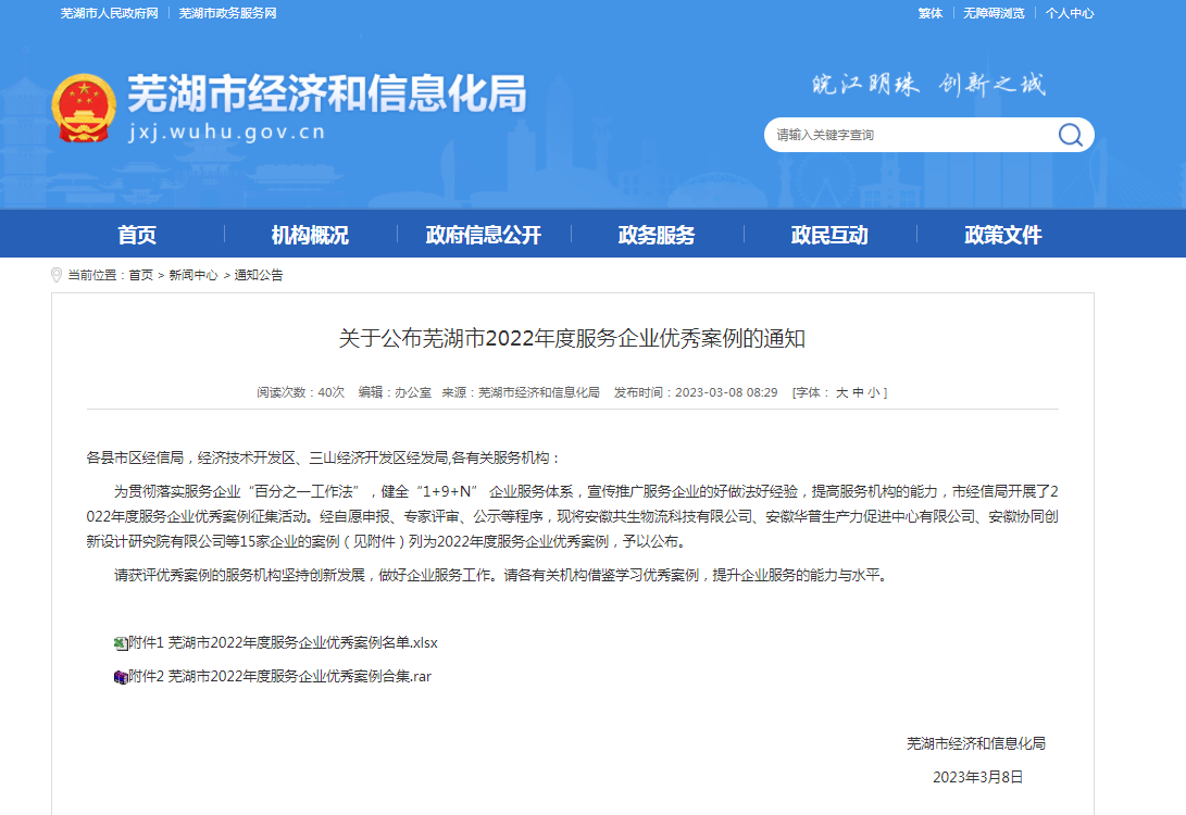 此次蕪湖市2022年度服務(wù)企業(yè)優(yōu)秀案例征集工作,由蕪湖市經(jīng)濟和信息化局遴選,旨在貫徹落實服務(wù)企業(yè)“百分之一工作法”,健全“1+9+N”企業(yè)服務(wù)體系,宣傳推廣服務(wù)企業(yè)的好做法好經(jīng)驗,提高服務(wù)機構(gòu)的能力。此次入選案例重點圍繞信息咨詢、技術(shù)創(chuàng)新、人才培訓(xùn)、市場開拓、管理咨詢、質(zhì)量管理、創(chuàng)業(yè)輔導(dǎo)、投資融資服務(wù)、信息化應(yīng)用服務(wù)等服務(wù)領(lǐng)域開展遴選工作。