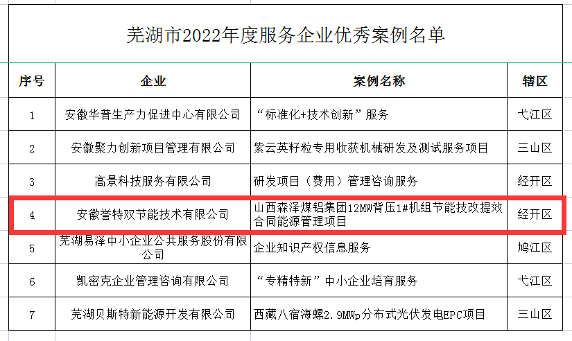 2023年3月8日我公司合作案例——山西森澤煤鋁集團12MW 背壓1#機組節(jié)能技改提效合同能源管理項目,入選蕪湖市2022年度服務(wù)企業(yè)優(yōu)秀案例,本次全市共計評選出15家服務(wù)企業(yè)優(yōu)秀案例,其中經(jīng)開區(qū)4家,我公司榮列榜單。