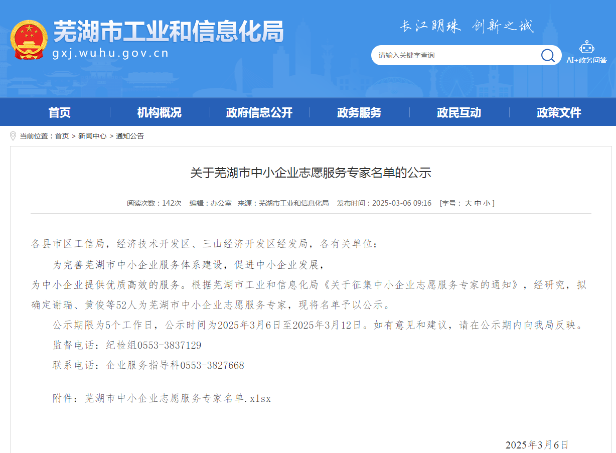 2025年3月6日,為完善蕪湖市中小企業(yè)服務(wù)體系建設(shè),促進(jìn)中小企業(yè)發(fā)展,為中小企業(yè)提供優(yōu)質(zhì)高效的服務(wù),由市工信局牽頭在全市范圍內(nèi)開展志愿專家征集評(píng)選工作,并最終確定52名各行業(yè)人員組成志愿專家團(tuán),我公司總經(jīng)理袁克、節(jié)能事業(yè)部長(zhǎng)湯偉兩位同志入選,在此表示熱烈祝賀。