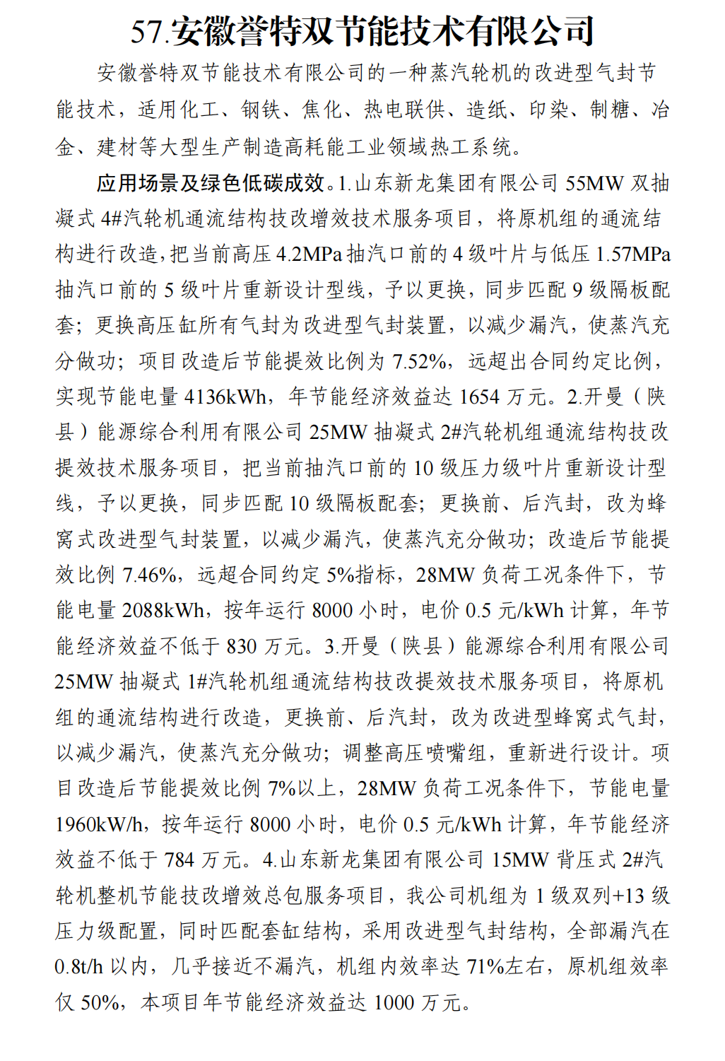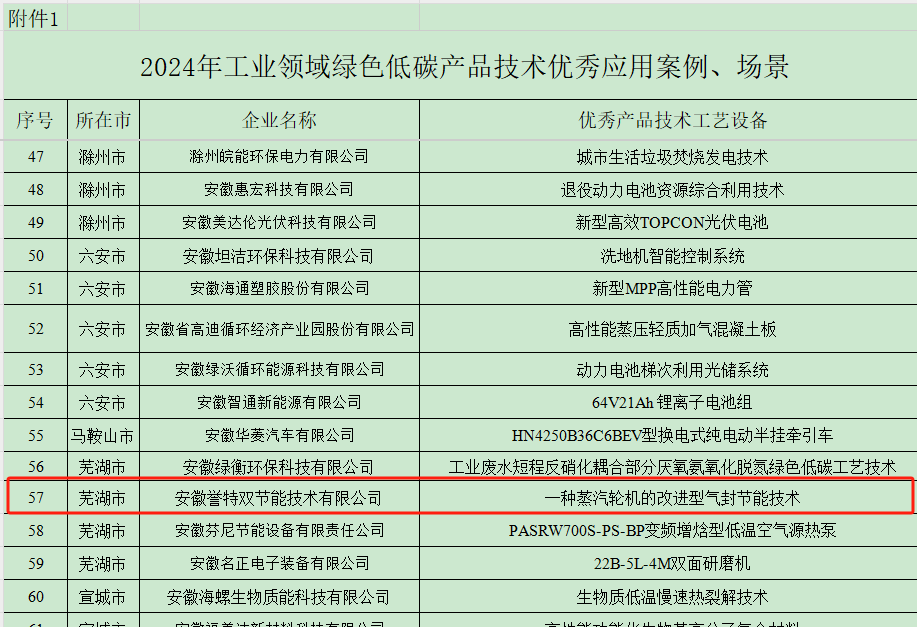 近日,安徽省工信廳為推進(jìn)新型工業(yè)化,加強(qiáng)工業(yè)領(lǐng)域綠色低碳技術(shù)、裝備、產(chǎn)品的推廣應(yīng)用,引導(dǎo)制造業(yè)綠色化發(fā)展,發(fā)布了2024年以來一批綠色低碳產(chǎn)品技術(shù)應(yīng)用推廣服務(wù)的優(yōu)秀案例與場(chǎng)景,并引導(dǎo)和支持有關(guān)企業(yè)加強(qiáng)供需對(duì)接和應(yīng)用,助力工業(yè)綠色低碳發(fā)展,其中我公司"一種蒸汽輪機(jī)的改進(jìn)型氣封節(jié)能技術(shù)"入選工業(yè)領(lǐng)域綠色低碳技術(shù)推廣目錄。